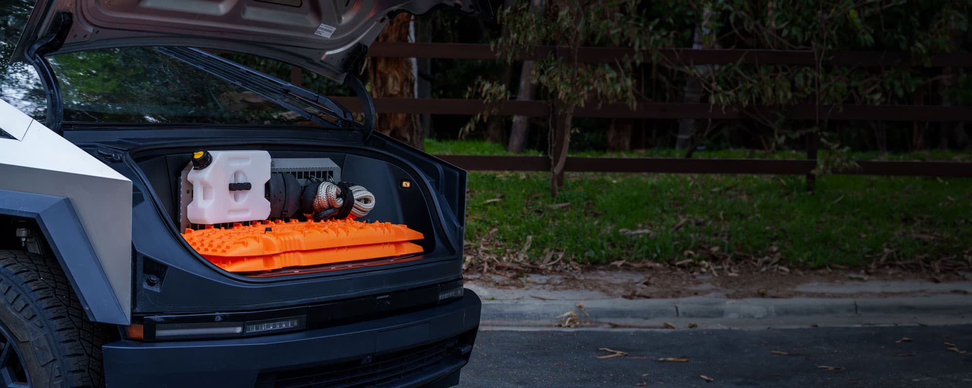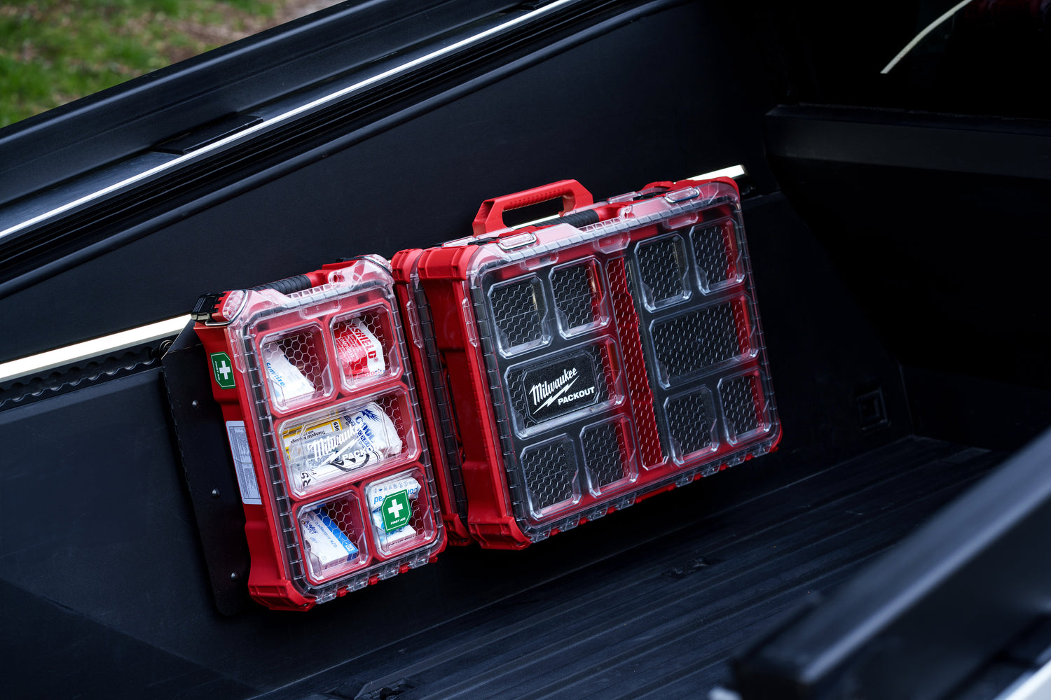 Already invested in Milwaukee tools? tackRAK supports your Packout toolboxes, organizers, and accessories directly to the frunk or L-tracks in the truck bed. The same boxes you use in your workshop or jobsite now snap securely into your truck