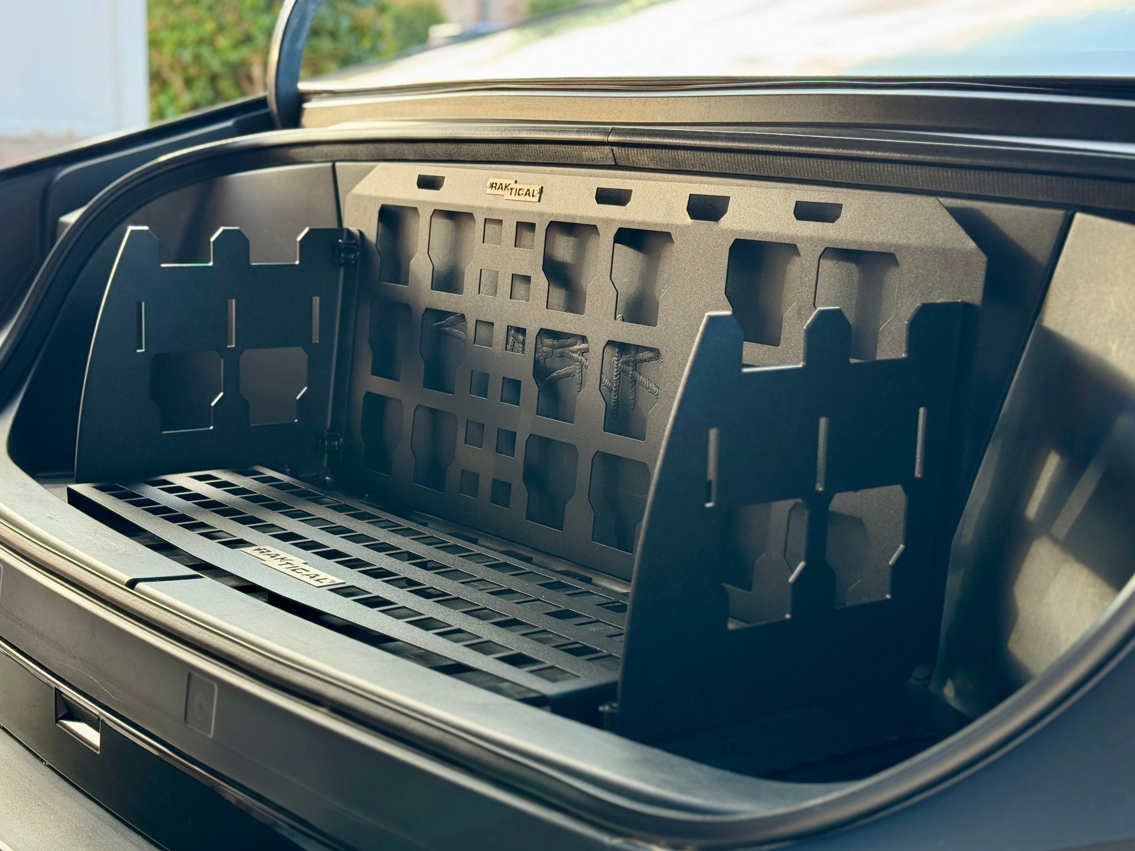Remove two factory bolts on each side of your frunk, install the tackRAK brackets and floor plates, then attach the panels. Then install to the frunk. Initial assembly takes less than 10mins. After that the Frunk kit can be removed as one piece in less than 1 minute.